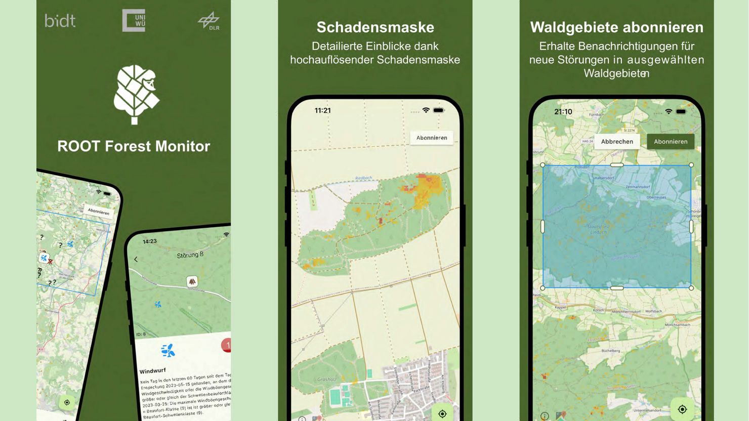 Since 2023, the ROOT project has developed modular workloads for processing image data from a wide range of sources. Using terrabyte, it initially processed long-term data from the DLR archive, generating time series starting from the drought years of 2018, thus laying the foundation for the continuous evaluation of current satellite data. In addition, an app (picture above) was developed that displays forest damage in Bavaria through clearly structured maps. “We want to be able to respond quickly to symptoms like snow breakage, drought, wind damage, fires, or insect infestations,” explains Herbst. “While state forests are systematically monitored, many privately owned forests cannot be managed as closely. This makes it harder to detect damage in a timely manner and delays necessary intervention.” As a result, diseases can spread more rapidly.