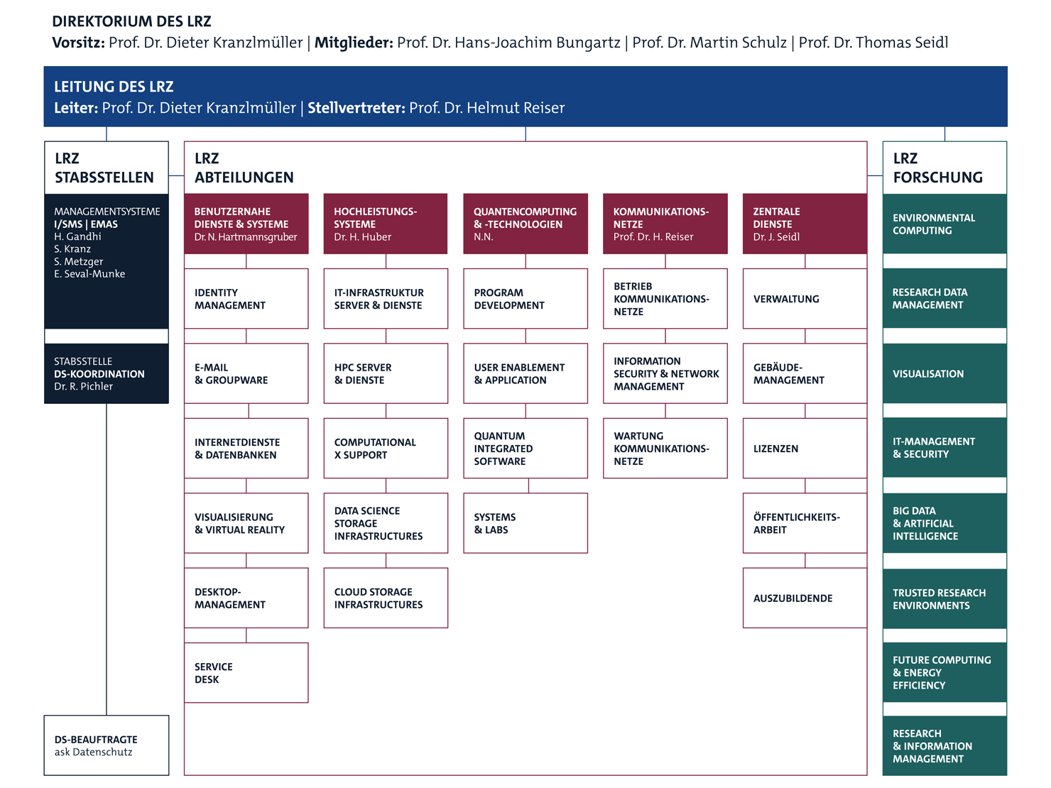 The LRZ’s leadership team is supported by four staff units that take care of service management, IT security and data protection. Below these are the five departments responsible for the activities, services and technical resources at the LRZ. As an interdisciplinary cross-sectional unit, the research team is based at the LRZ, which is divided into the seven subject areas of Environment Computing, Research Data Management, Visualisation, IT Management and Security, Big Data and Artificial Intelligence, Trusted Research Environments, Future Computing and Energy Efficiency as well as Research and Information Management.
